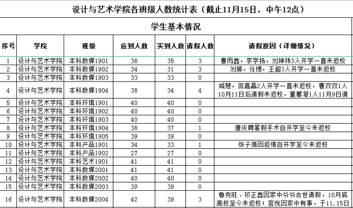 截至到2022年11月15日,yl23455永利集团应到学生3273人,实到学生3179人,尚有94名未返校学生,下表为yl23455永利集团未返校人数统计及未返校原因统计表。