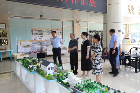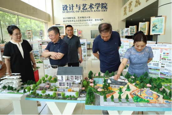 在学院领导及教师陪同下,校领导们首先参观了环境设计专业学生作品展区,认真观看了城市老旧社区微更新模型、特色商业空间方案及可持续社区景观设计。王校长和刘督学对同学们展现的空间规划能力、文化保护意识和环保理念给予肯定,特别关注了部分项目中的地域文化活化与生态修复方案。