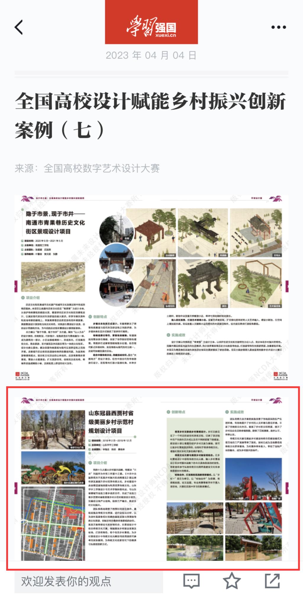 2023年4月4日,第十届全国高校数字艺术设计大赛学生作品《找到你》、《“消防萌宝的日常”系列表情包》和教师作品全国高校设计赋能乡村振兴创新案例《山东冠县西贾村省级美丽乡村示范村规划设计项目》在学习强国平台展出。
